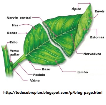 · El limbo o lámina. Es la parte generalmente laminar plana, verde y ancha de la hoja; la cara superior se llama haz y la cara inferior envés; el haz suele ser de color oscuro y el envés algo más claro. La base del limbo se agranda a veces para albergar la yema, siempre presente en la axila de la hoja (yema axilar).